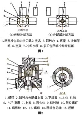 2.多工位回轉(zhuǎn)臺(tái)冷卻分配器 這種方法見圖1b,由于冷卻分配器是裝在回轉(zhuǎn)臺(tái)上的,不受各種運(yùn)動(dòng)部件的限制,這種裝置能將大流量、有一定壓力的冷卻液直接冷卻刀具、工件,使工件和刀具得到充分地冷卻,減少熱變形,提高刀具的使用壽命。大流量的冷卻液還能沖走切屑,方便上下料。