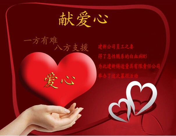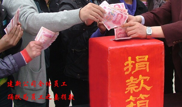 2014年7月1日下午,建新公司簡單的舉行了“向員工明福濤之妻獻愛心”的募捐儀式,用一份份真摯的愛心筑起希望的長城。當建新公司代表把錢親手送到員工手里時,他熱淚盈眶。用深深的一個鞠躬表達了對建新全體員工的感激之情。